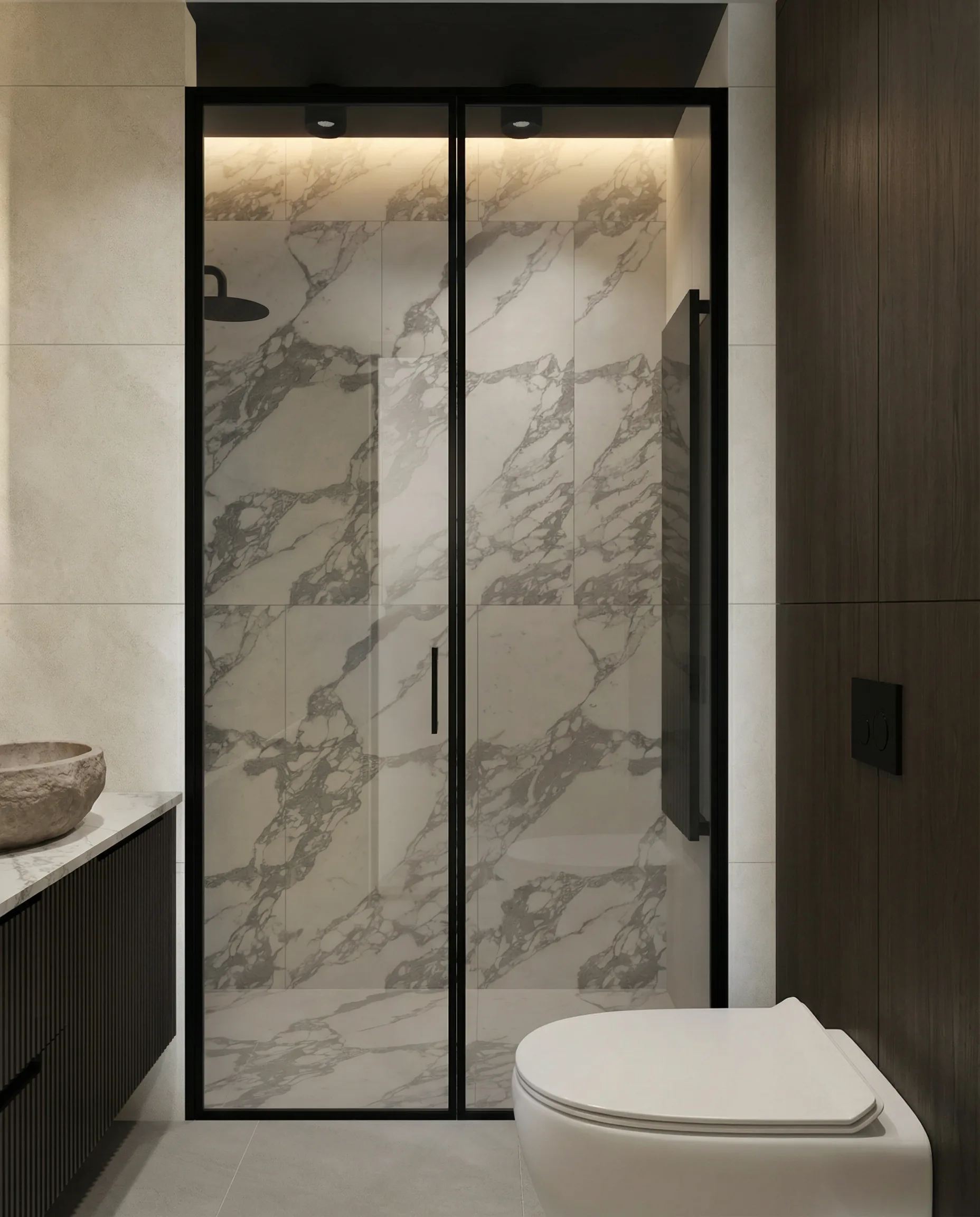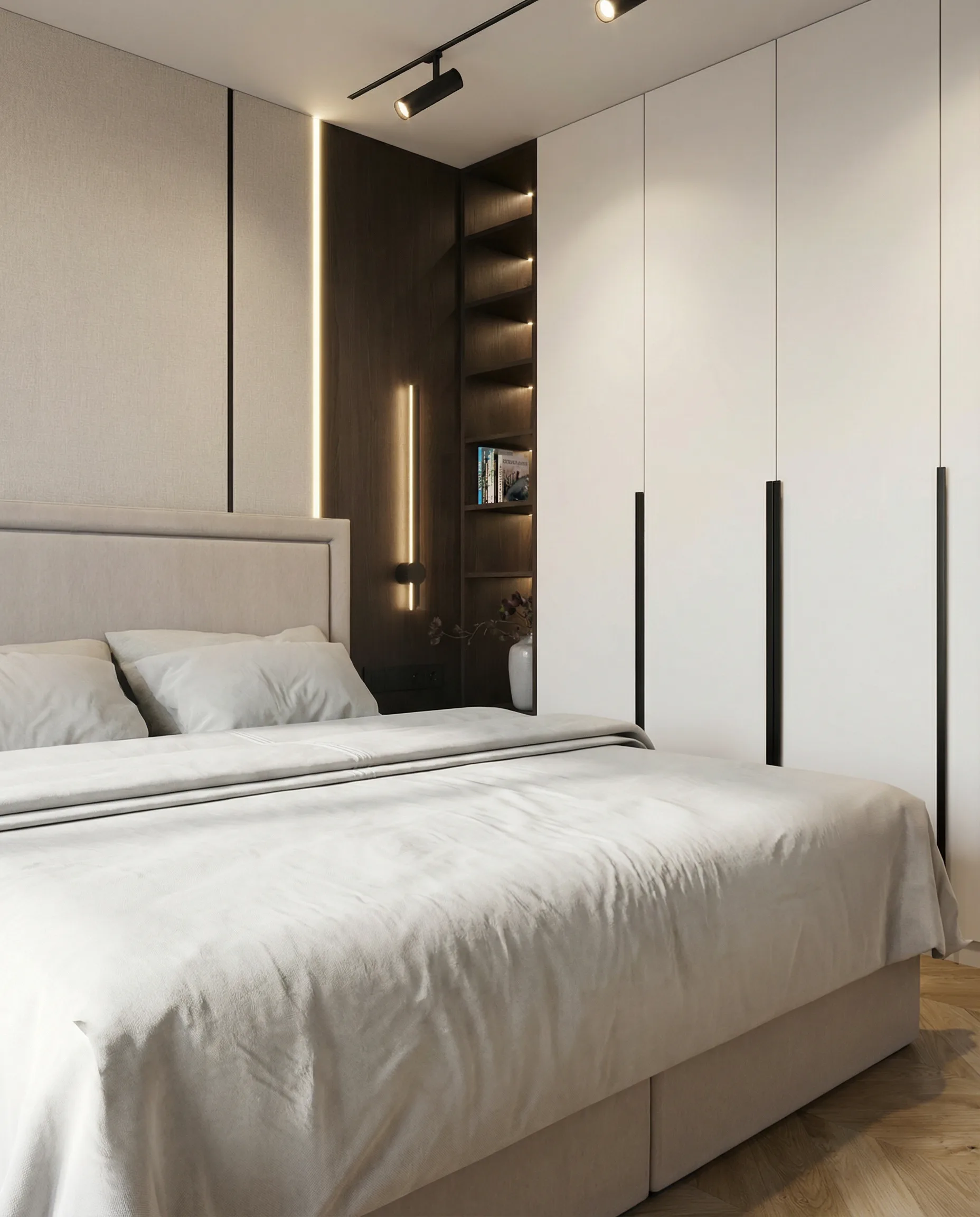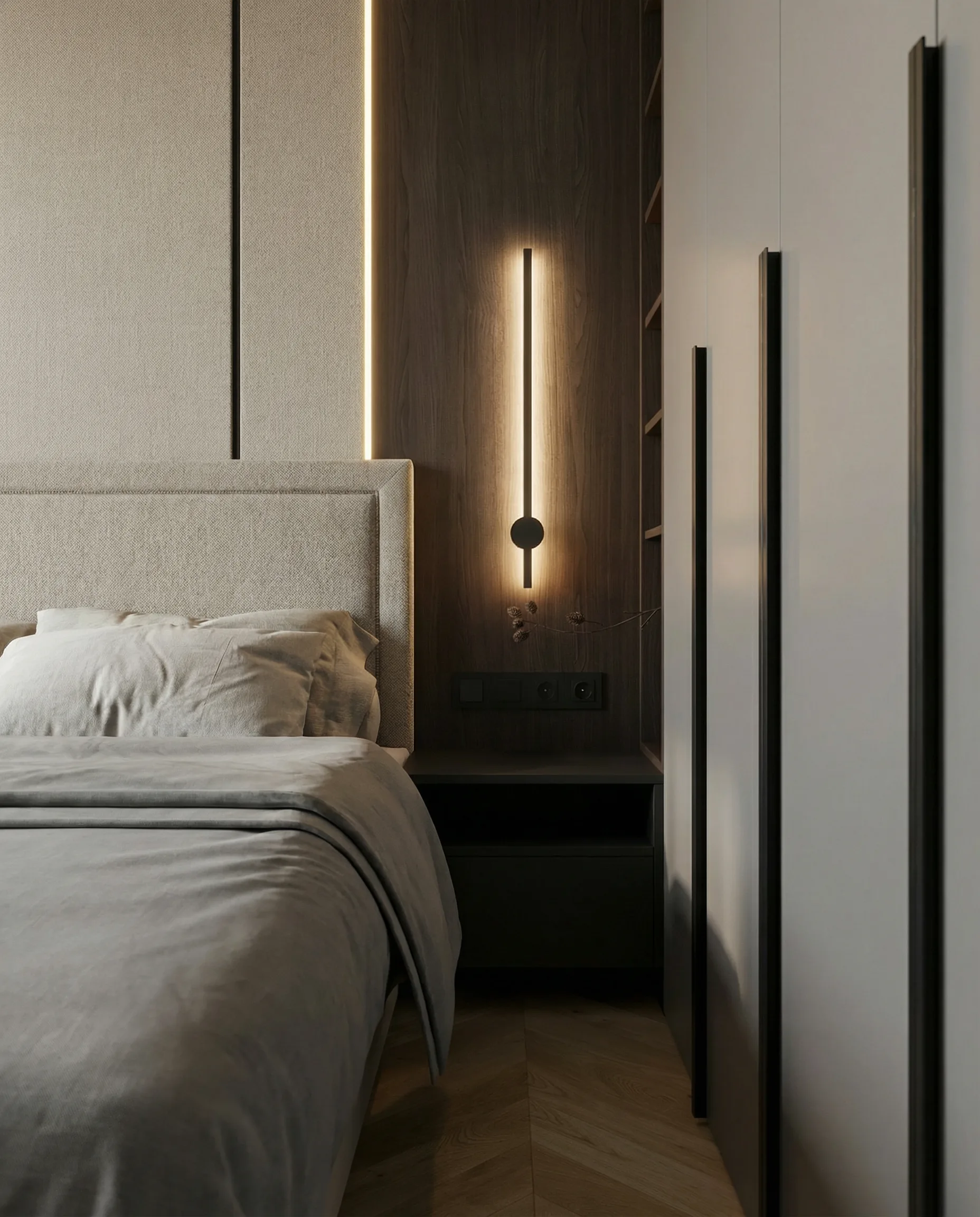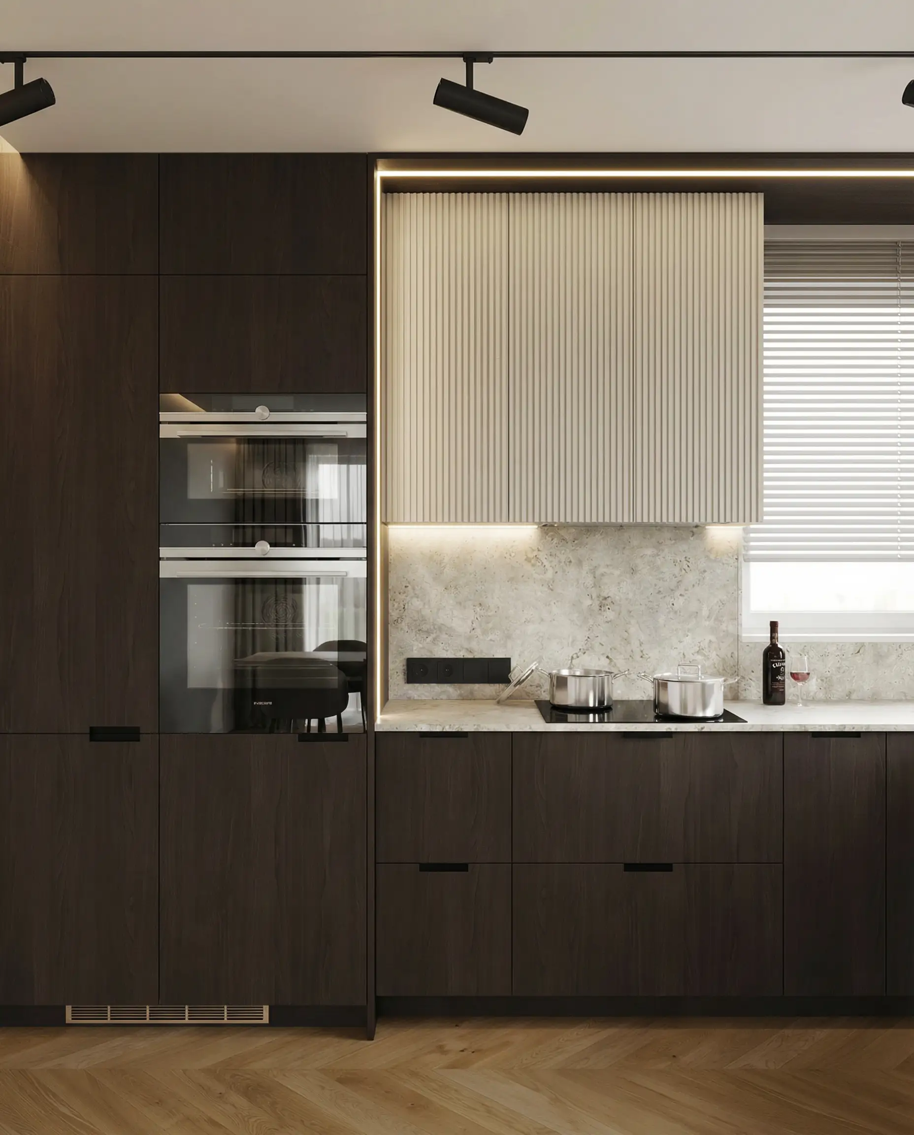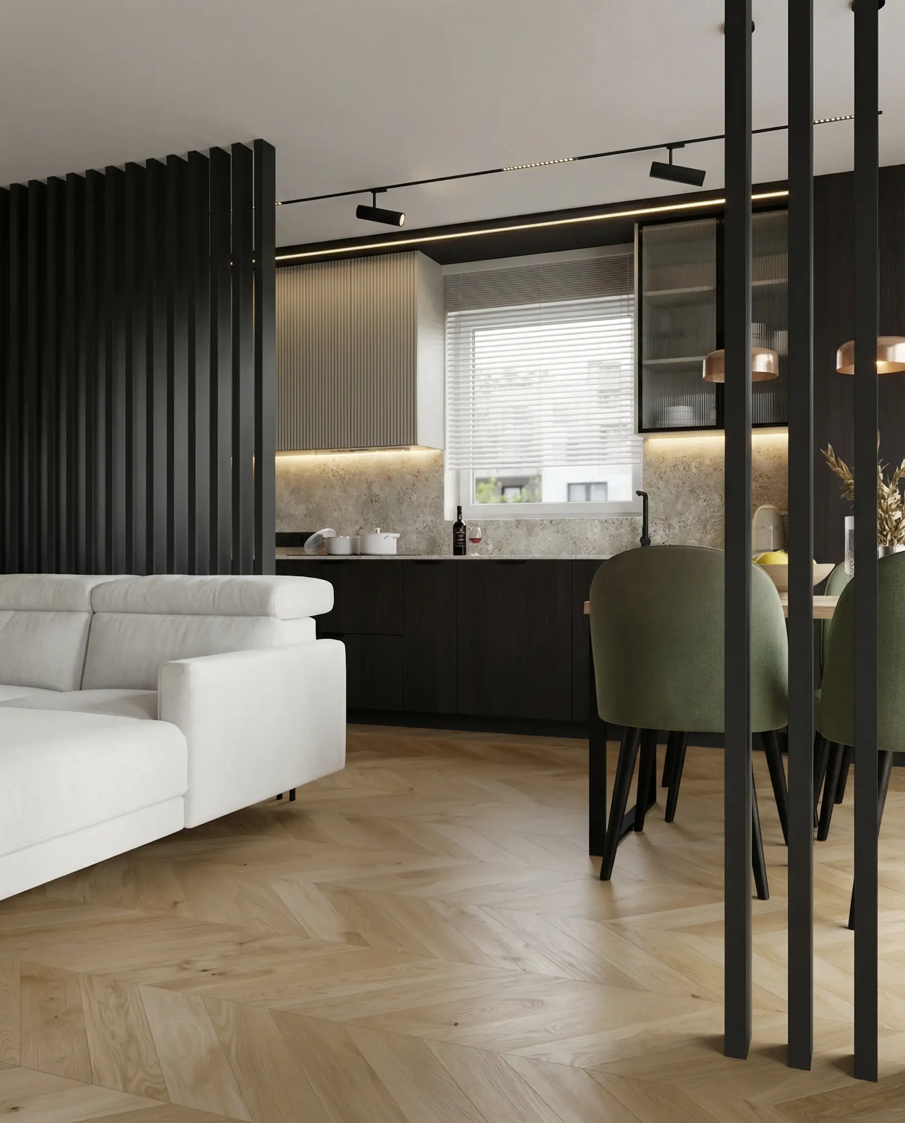 Postawiliśmy na dębową podłogę w jodełkę francuską oraz dużą ilość fornirowanych zabudów, które podniosły standard wykończenia i nadały wnętrzu spójny charakter. Drzwi ukryte w ścianach oraz wykończenia fornirowane pozwoliły zachować czystość formy i uporządkowaną estetykę. Na sufitach zastosowaliśmy podwieszenia, które umożliwiły ukrycie oświetlenia — w tym podtynkowych szynoprzewodów. Wszystkie meble zostały zaprojektowane indywidualnie do wykonania przez stolarza, z wykorzystaniem naturalnych materiałów, takich jak forniry drewniane i kamienne blaty. W łazience zaplanowałem subtelny akcent w postaci kamiennego forniru na ścianie z lustrem, który przełamuje jednolitą powierzchnię i dodaje głębi.