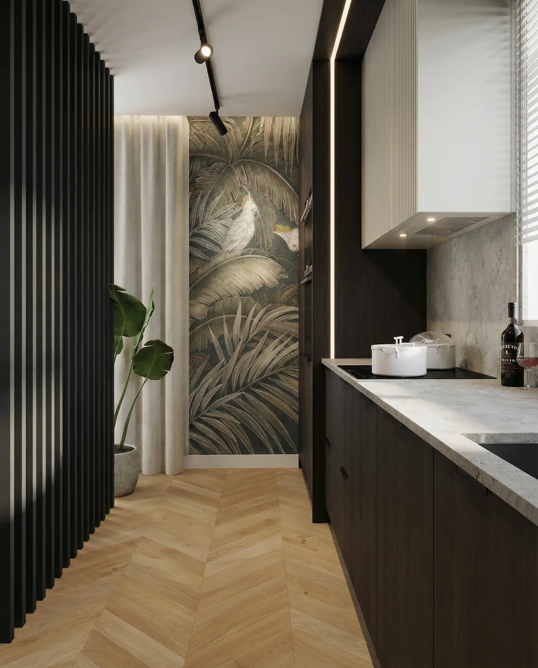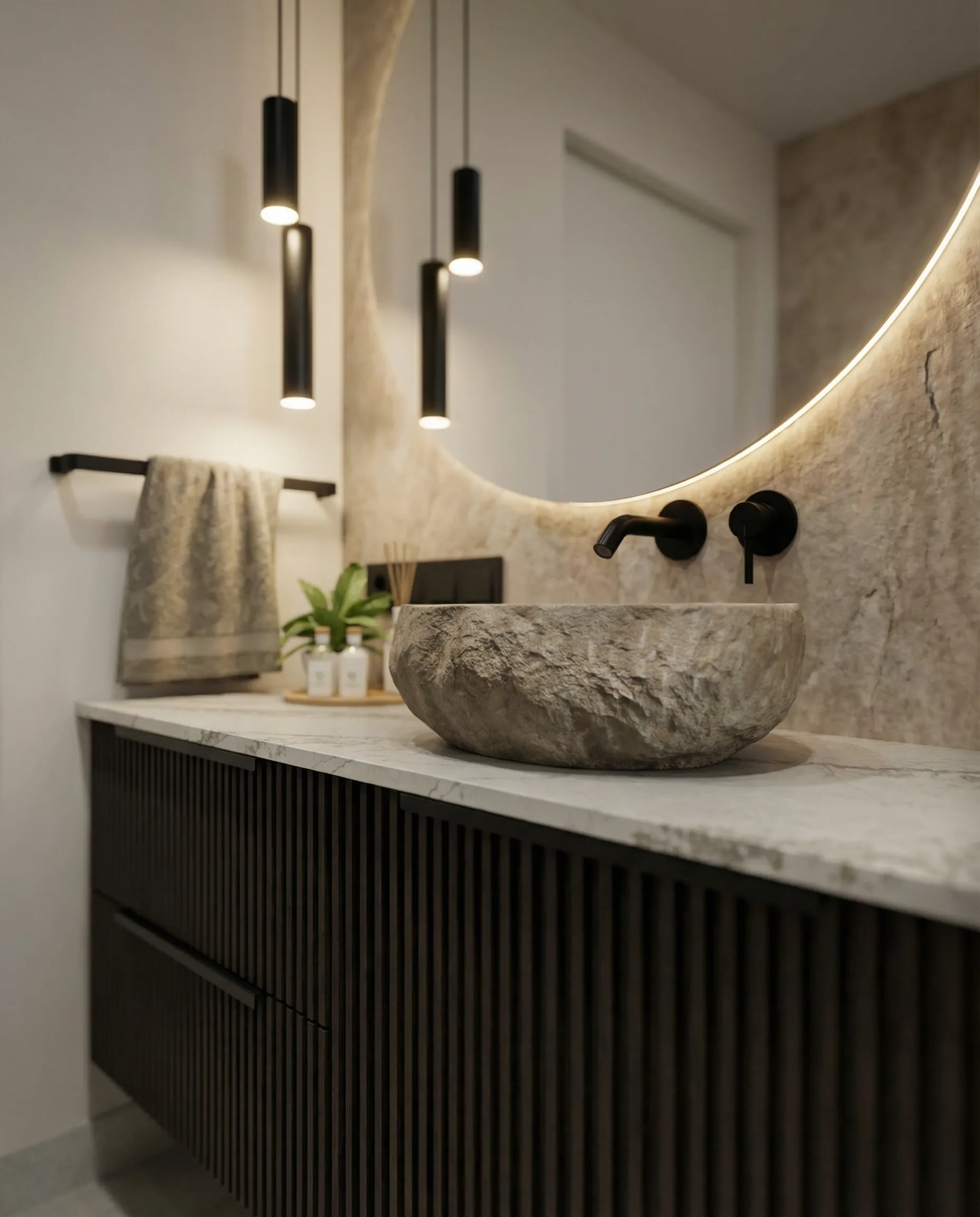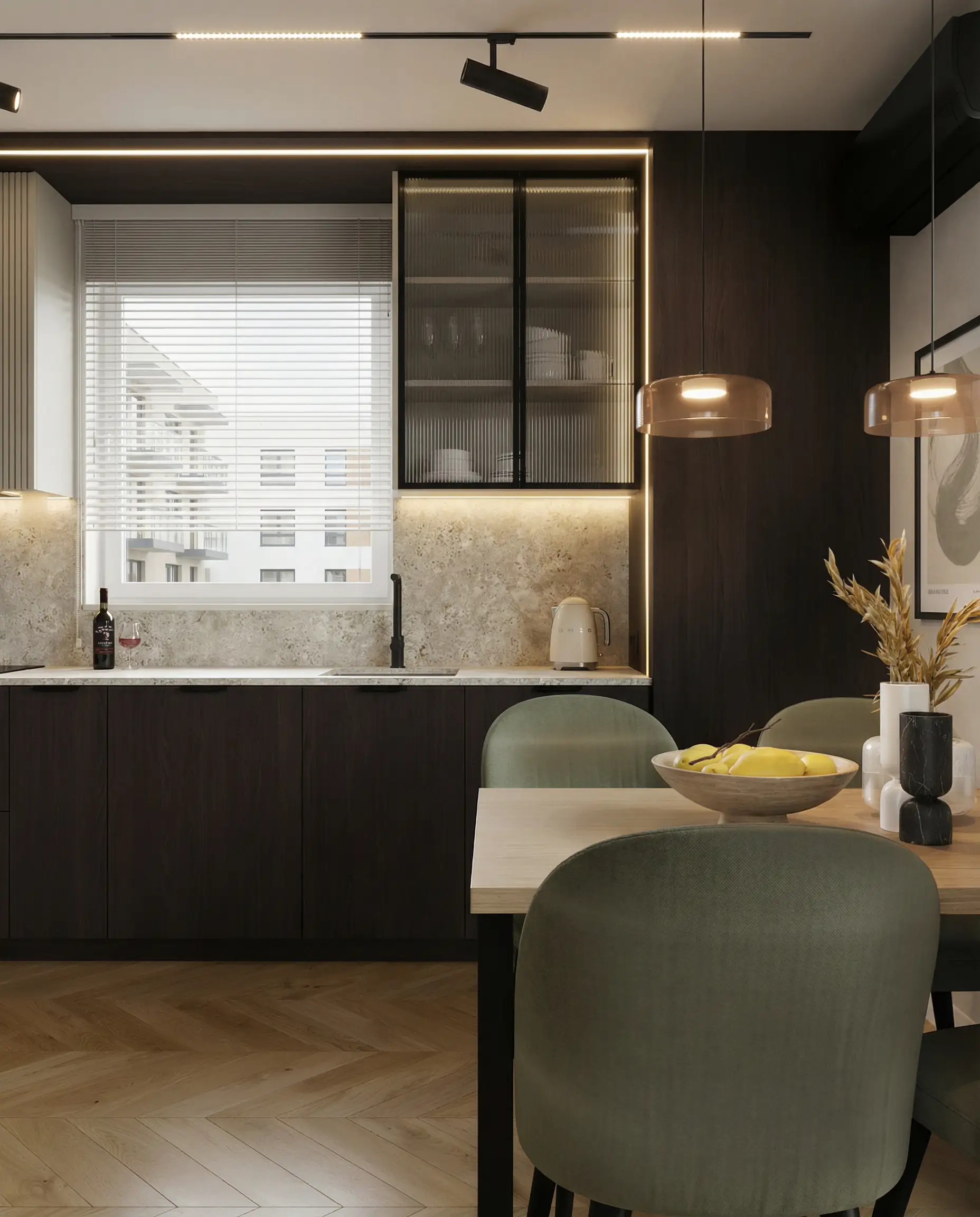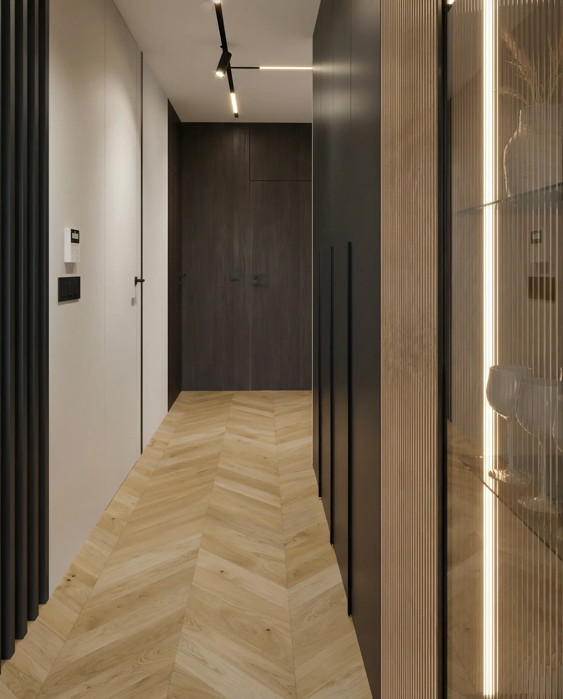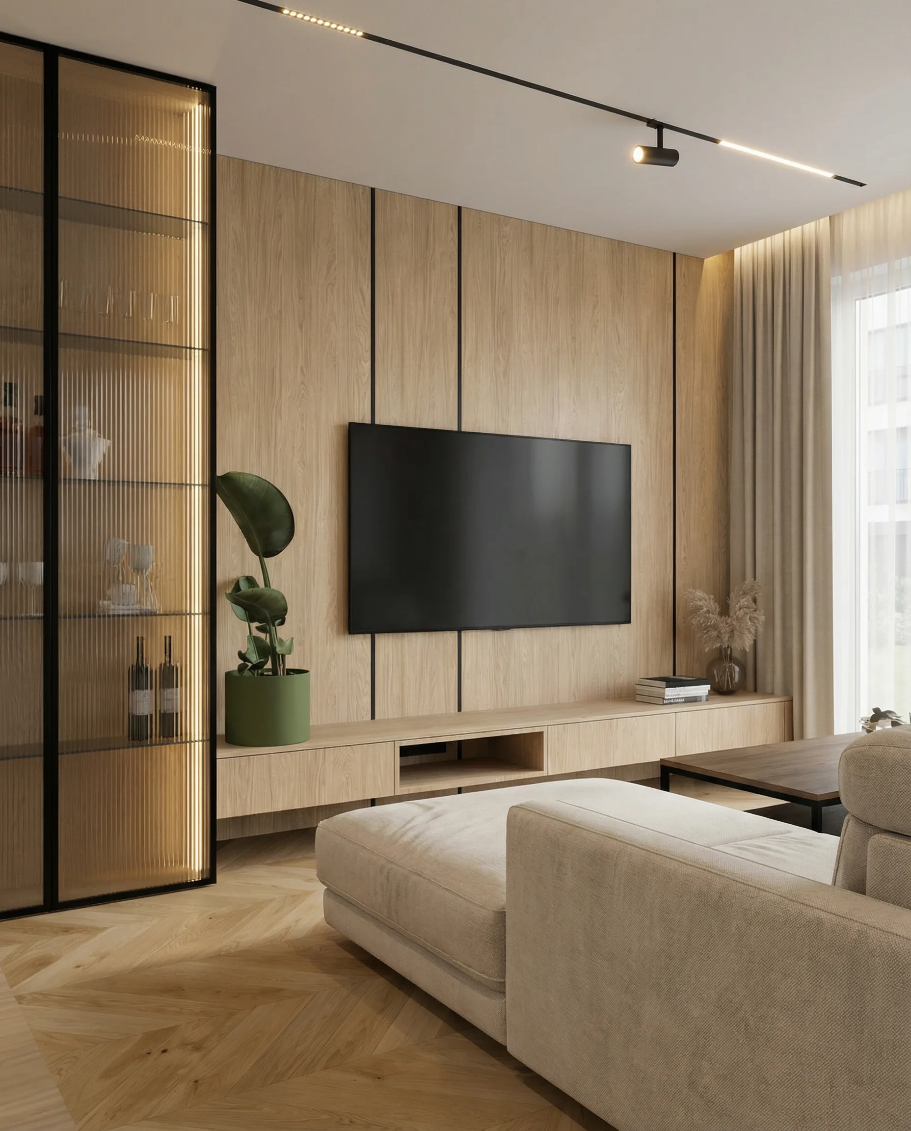 Postawiliśmy na dębową podłogę w jodełkę francuską oraz dużą ilość fornirowanych zabudów, które podniosły standard wykończenia i nadały wnętrzu spójny charakter. Drzwi ukryte w ścianach oraz wykończenia fornirowane pozwoliły zachować czystość formy i uporządkowaną estetykę. Na sufitach zastosowaliśmy podwieszenia, które umożliwiły ukrycie oświetlenia — w tym podtynkowych szynoprzewodów. Wszystkie meble zostały zaprojektowane indywidualnie do wykonania przez stolarza, z wykorzystaniem naturalnych materiałów, takich jak forniry drewniane i kamienne blaty. W łazience zaplanowałem subtelny akcent w postaci kamiennego forniru na ścianie z lustrem, który przełamuje jednolitą powierzchnię i dodaje głębi.
