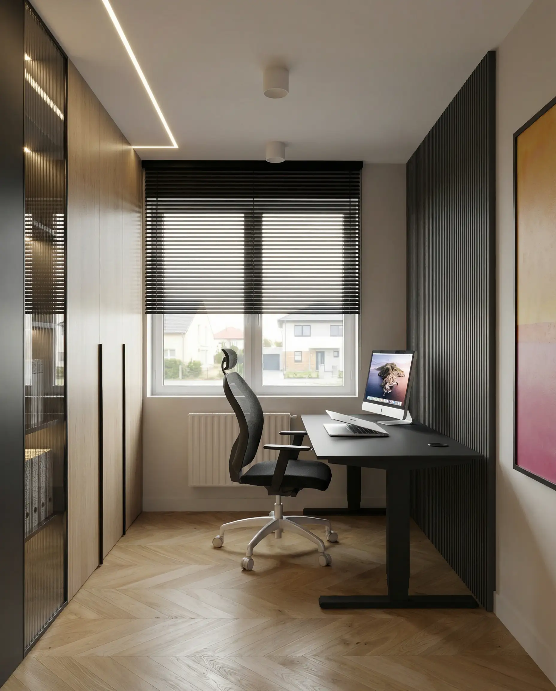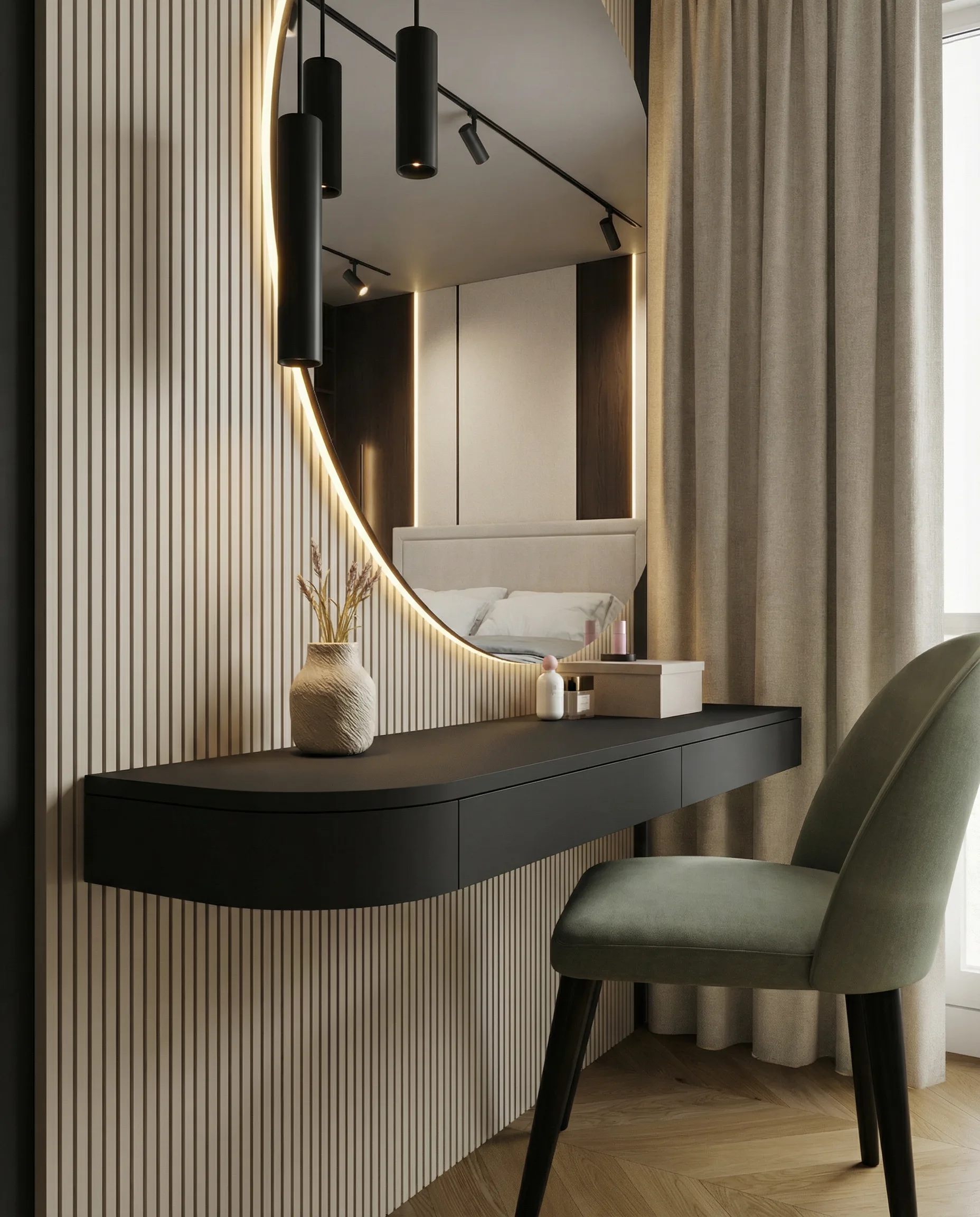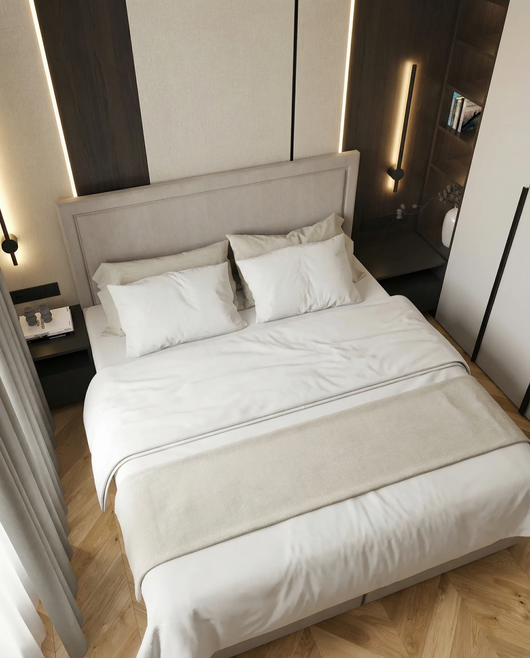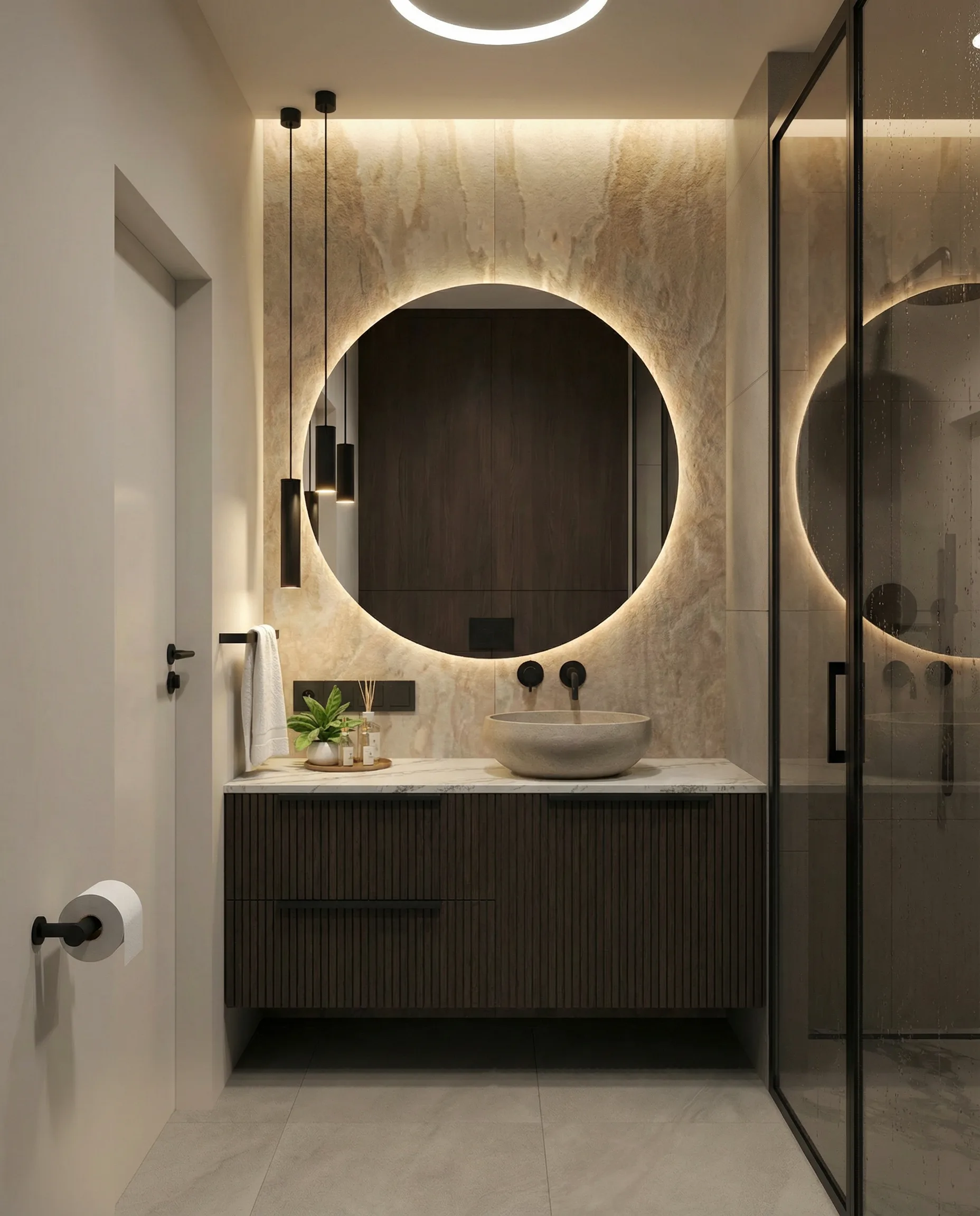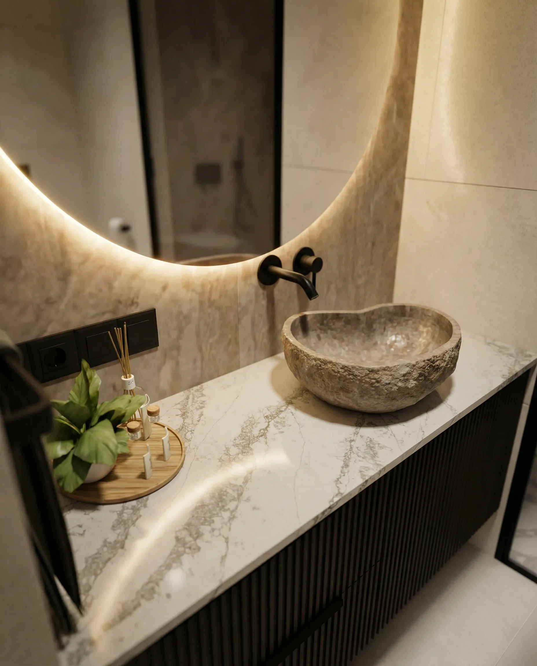 Postawiliśmy na dębową podłogę w jodełkę francuską oraz dużą ilość fornirowanych zabudów, które podniosły standard wykończenia i nadały wnętrzu spójny charakter. Drzwi ukryte w ścianach oraz wykończenia fornirowane pozwoliły zachować czystość formy i uporządkowaną estetykę. Na sufitach zastosowaliśmy podwieszenia, które umożliwiły ukrycie oświetlenia — w tym podtynkowych szynoprzewodów. Wszystkie meble zostały zaprojektowane indywidualnie do wykonania przez stolarza, z wykorzystaniem naturalnych materiałów, takich jak forniry drewniane i kamienne blaty. W łazience zaplanowałem subtelny akcent w postaci kamiennego forniru na ścianie z lustrem, który przełamuje jednolitą powierzchnię i dodaje głębi.