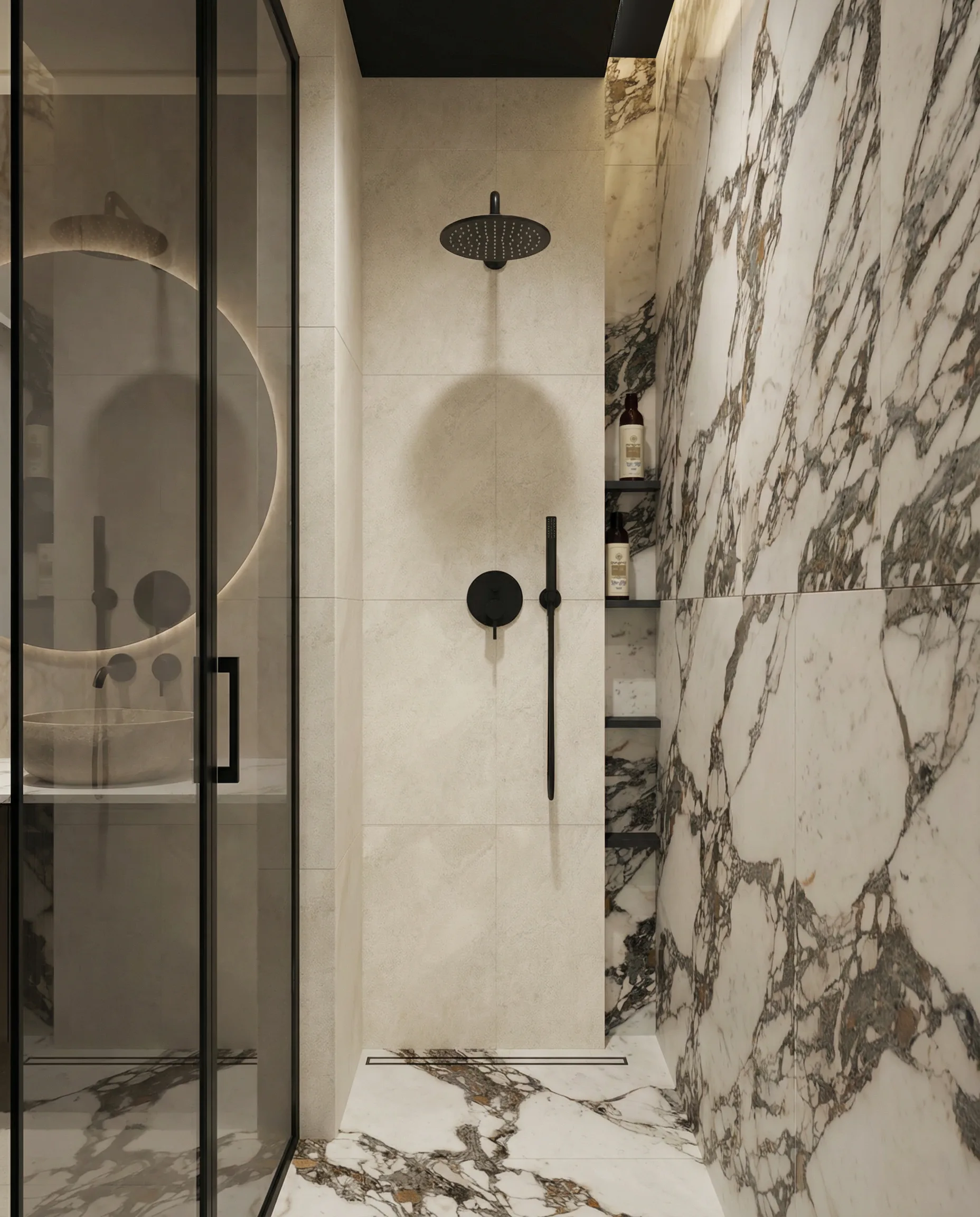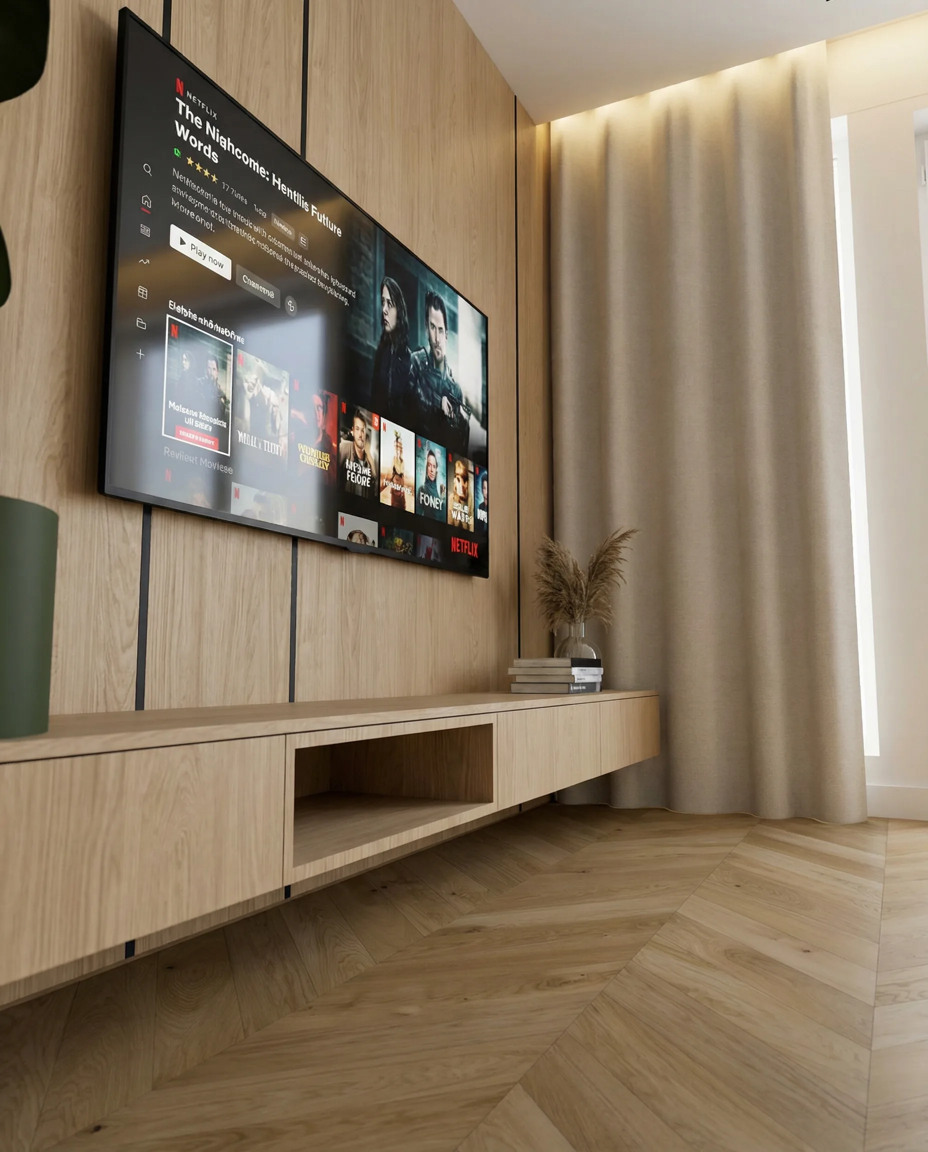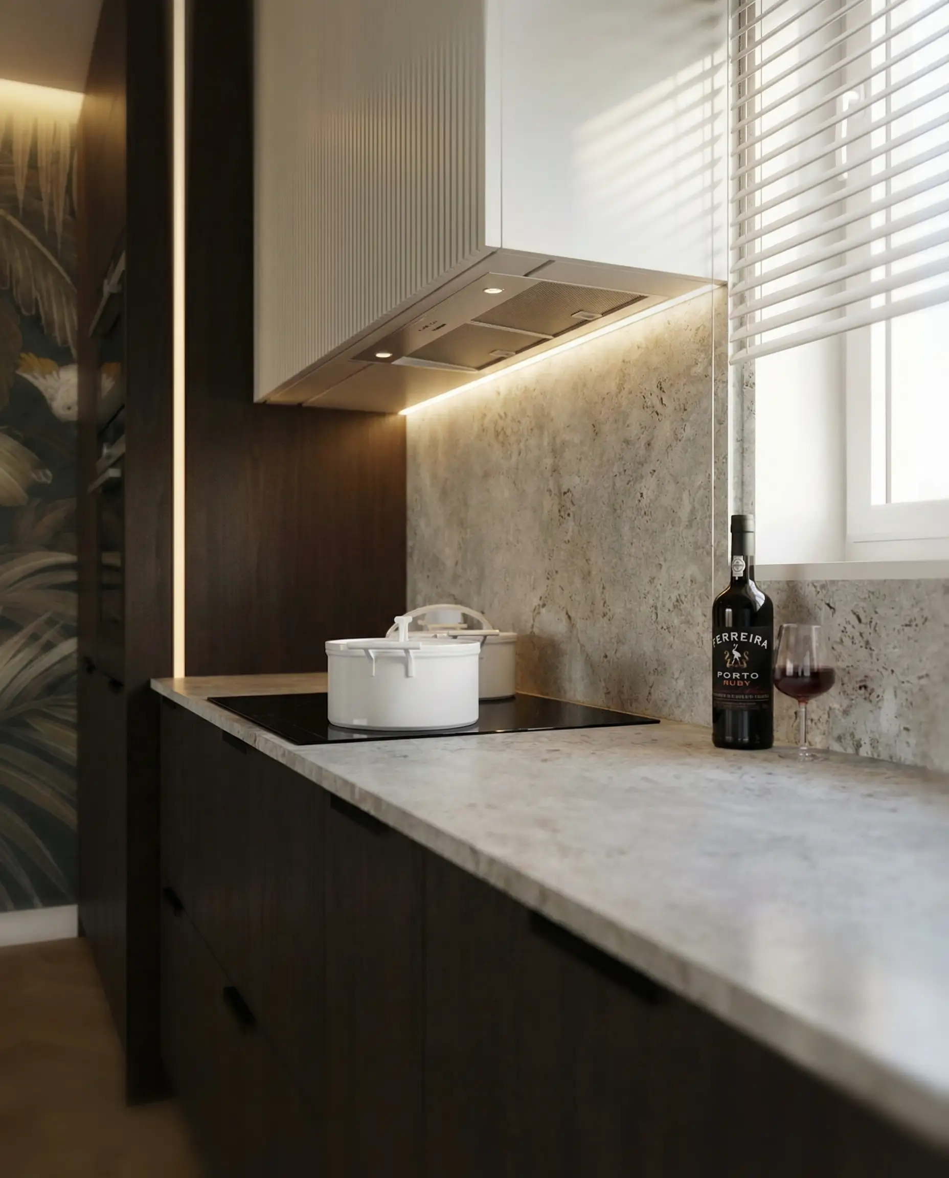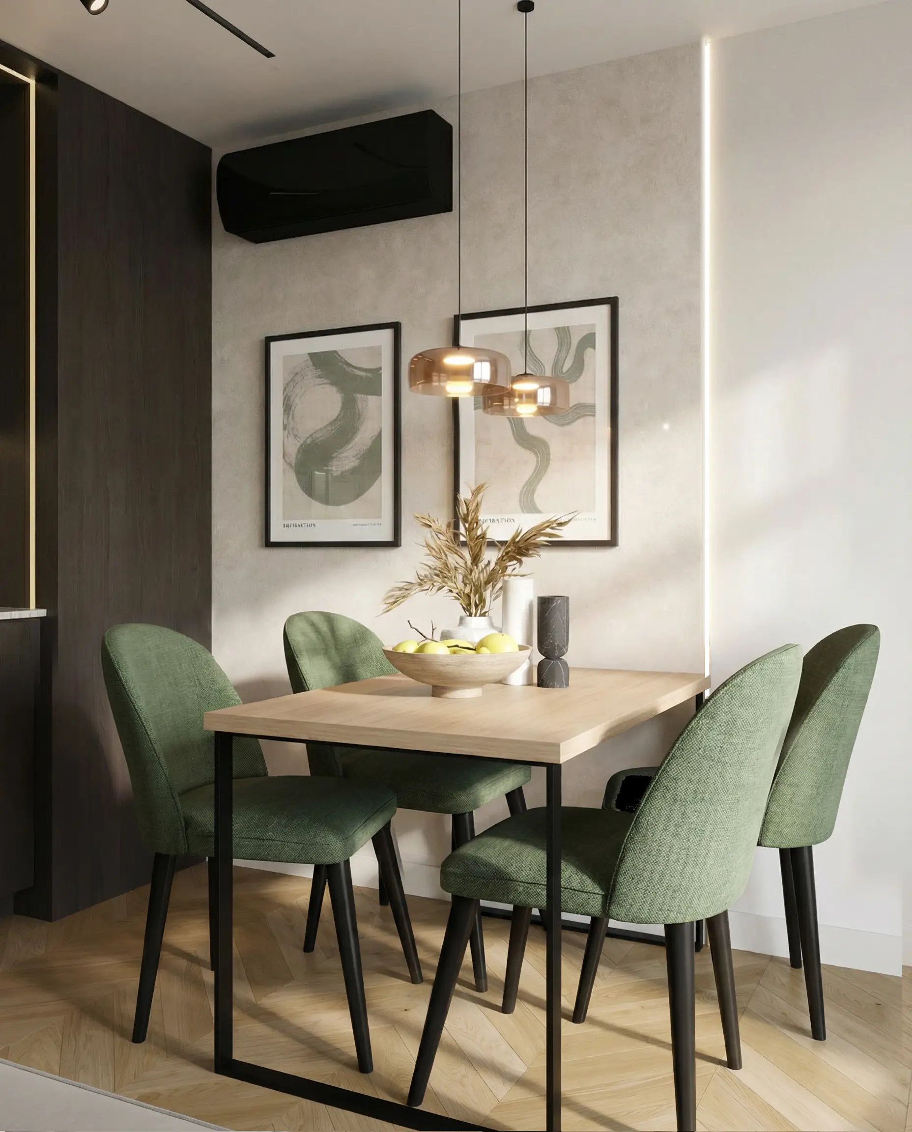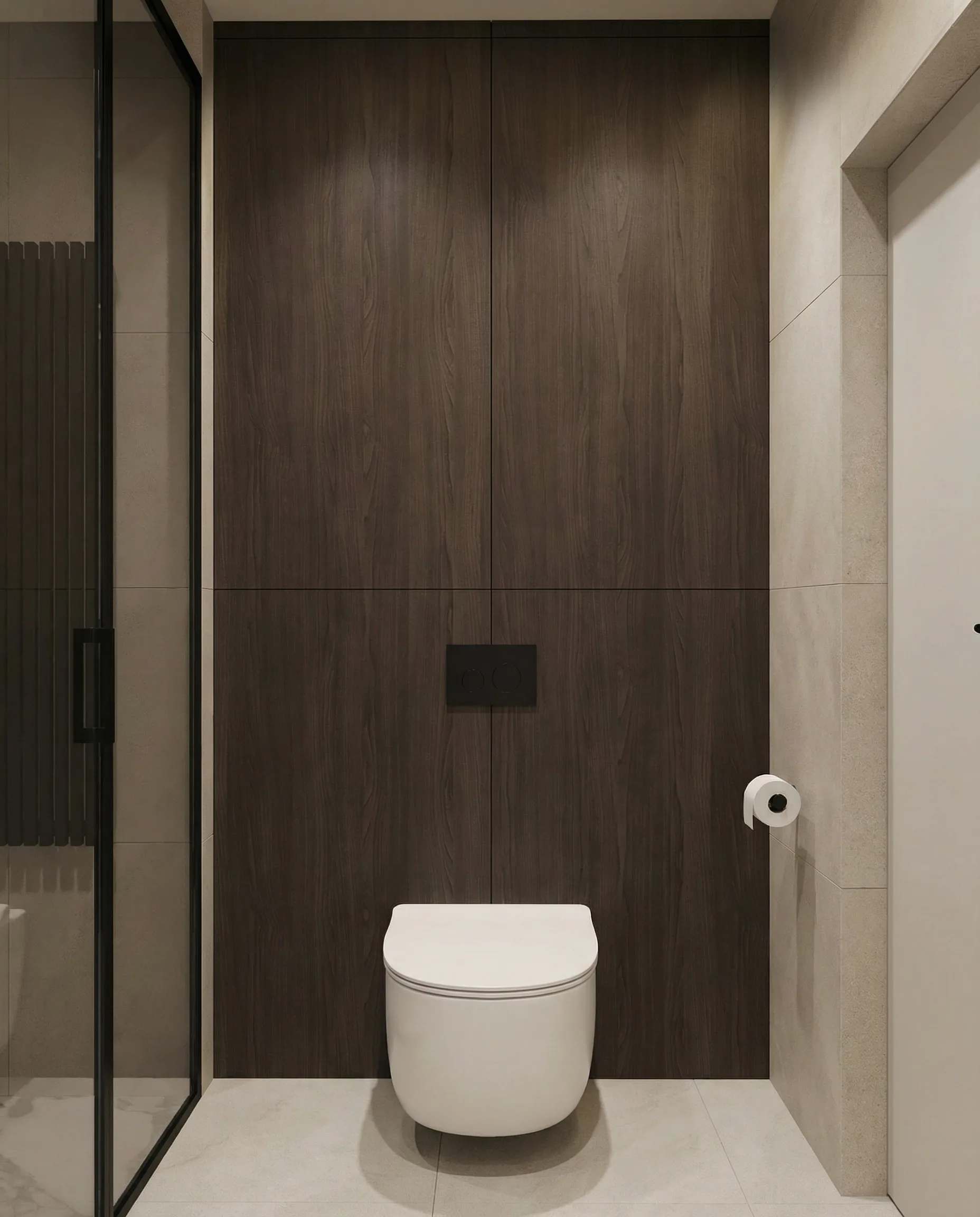 Postawiliśmy na dębową podłogę w jodełkę francuską oraz dużą ilość fornirowanych zabudów, które podniosły standard wykończenia i nadały wnętrzu spójny charakter. Drzwi ukryte w ścianach oraz wykończenia fornirowane pozwoliły zachować czystość formy i uporządkowaną estetykę. Na sufitach zastosowaliśmy podwieszenia, które umożliwiły ukrycie oświetlenia — w tym podtynkowych szynoprzewodów. Wszystkie meble zostały zaprojektowane indywidualnie do wykonania przez stolarza, z wykorzystaniem naturalnych materiałów, takich jak forniry drewniane i kamienne blaty. W łazience zaplanowałem subtelny akcent w postaci kamiennego forniru na ścianie z lustrem, który przełamuje jednolitą powierzchnię i dodaje głębi.